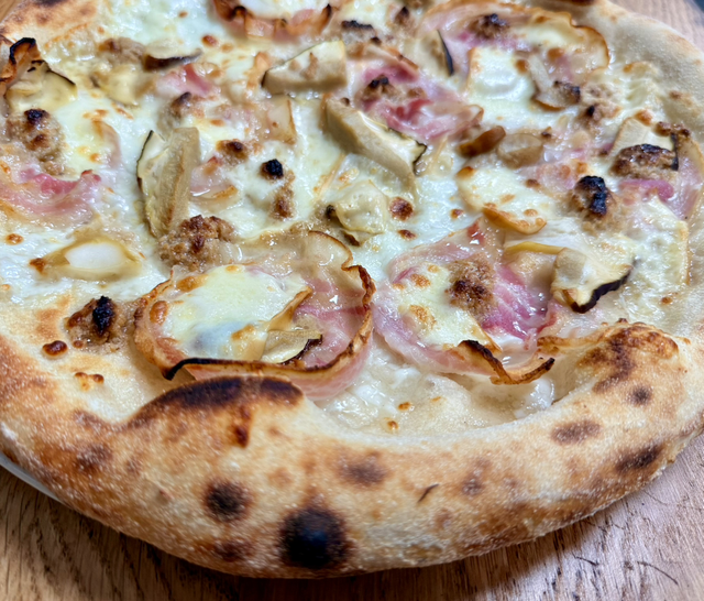 Mozzarella, scamorza affumicata, crema di noci, pancetta, porcini